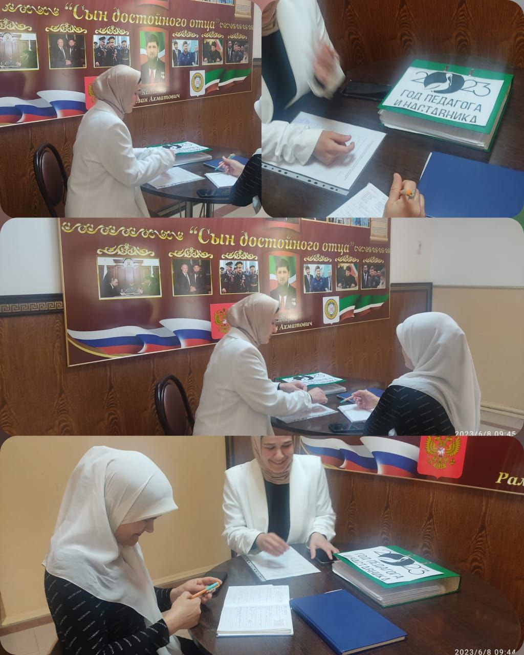 Наставник Аюбова Жарадат Мусаевна дает молодому специалисту методические рекомендации по правильности составления поурочного планирования в рамках обновленного ФГОС ООО – 2021, делает анализ проведенных им уроков.