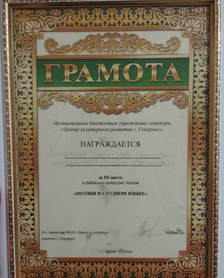 В данном мероприятии достойно выступила и заняла третье место ученица 9 класса МБОУ "Гордали-Юртовская СШ" Ахматова Товрат. (Учитель чеченского языка и литературы Эсилаева Айнаъ Халидовна)