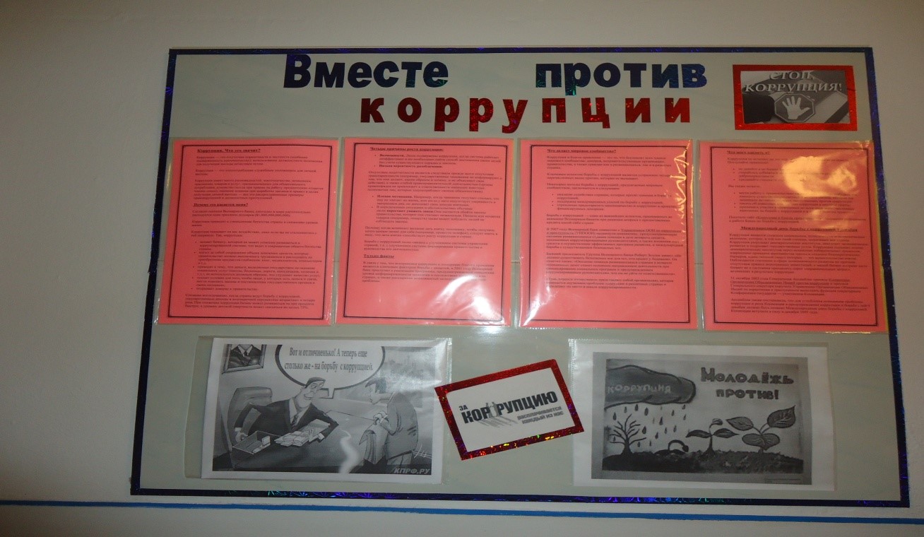 В соответствии с поставленными задачами и в соответствии плана воспитательной работы школы по противодействию коррупции, с целью формирования антикоррупционного мировоззрения у школьников, предупреждения коррупционных проявлений в сфере образования проведена тематическая декада «Скажем коррупции НЕТ!», посвященная Международному Дню борьбы с коррупцией . Был составлен график проведения мероприятий «Скажем коррупции НЕТ!» в 5-6 классах, «Преимущество соблюдения законов» в 7-8 классах, «Можно ли бороться с коррупцией» в 9-11 классах. В рамках тематической недели проведены классные часы на темы: «Что такое хорошо, и что такое плохо?» в 1-4 классах, «Можно и нельзя».