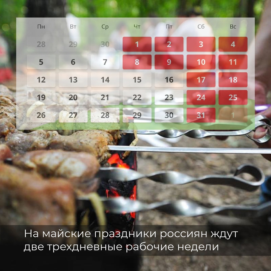 26.04.2025В текущую и следующую недели россияне будут работать по три дня и отдыхать по четыре дня. 30 апреля является предпраздничным рабочим днём, продолжительность которого сокращена на 1 час. 1 мая — праздничный выходной, 2 мая — перенесённый выходной, 3 и 4 мая — стандартные выходные дни. Далее идут 8 мая — перенесённый выходной, 9 мая — День Победы (государственный праздник), 10 и 11 мая — стандартные выходные дни.Следующая сокращенная неделя ожидает россиян в июне в связи с празднованием Дня России — 12 и 13 июня (четверг и пятница) будут выходными днями.