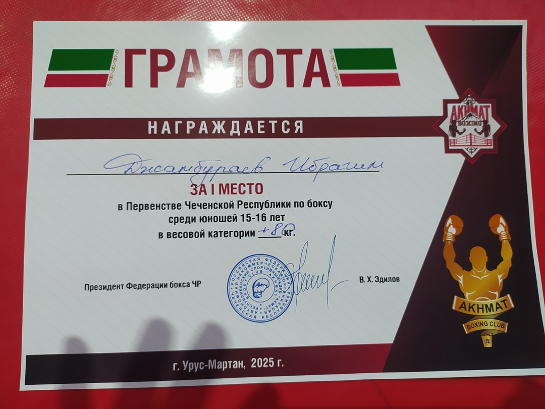 Наш ученик 9 «б» класса Джамбураев Ибрагим занял первое место в Первенстве Чеченской Республики по боксу среди юношей 15-16 лет.Гордимся . Дала т1аьхье беркате йойла!
