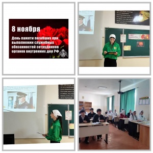 08.11.2025МБОУ "Гордали-Юртовская СШ " активисты ЧРОО ЕДЮО "Юные Кадыровцы" провели классный час День памяти погибших при выполнении служебных обязанностей сотрудников органов внутренних дел РФ» к 8 ноября 8 ноября — День памяти погибших при исполнении служебных обязанностей сотрудников органов внутренних дел России. Этот день — дань глубокого уважения героям, которые ценой своей жизни защищали наш мир, семьи и будущее. Их мужество и самоотверженность напоминают: безопасность — это не абстракция, а ежедневный подвиг.8 ноября прошла беседа, посвященная памяти героев. Ученики делились мыслями и историями .Такие беседы важны для воспитания патриотизма, чувства гражданственности и ответственности за свою страну. Знание о героях, их поступках, формирует у молодого поколения правильное представление о моральных ценностях, учит уважать прошлое и строить достойное будущее.Светлая память героям! Пусть их подвиг вдохновляет нас на добрые дела.