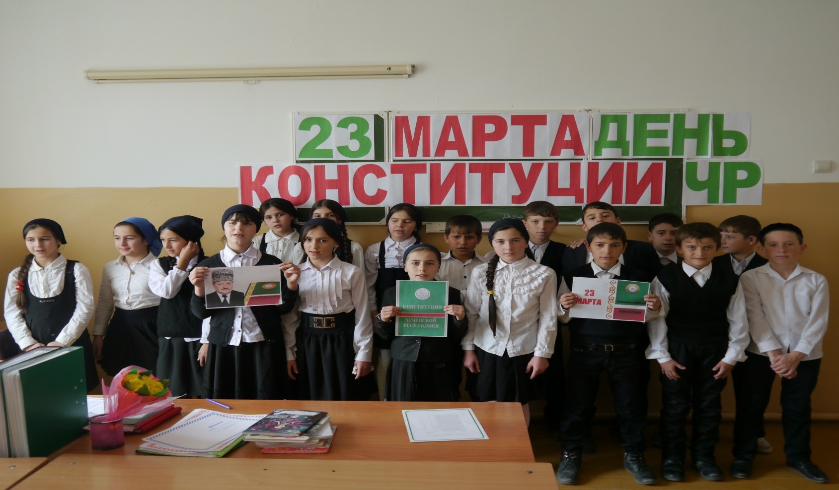 Проведены классные часы учителями среднего и начального звена.«Мы, многонациональный народ Чеченской Республики», «Наша малая Родина-Чечня», «Герб, флаг, гимн Чеченской Республики». Осознавая свою историческую ответственность за утверждение гражданского мира и согласия в Чеченской Республике,стремясь защитить права и свободы человека как высшую ценность и укрепить демократические основы общества,руководствуясь общепризнанными принципами равноправия и самоопределения народов,исходя из ответственности перед прошлым, настоящим и будущим общества и народа,свидетельствуя о своей исторической общности с Россией и ее многонациональным народом .Подтверждая лучшие традиции народов Чеченской Республики и всей Российской Федерации,чтя память предков, передавших нам любовь и уважение к земле отцов, веру в добро и справедливость, провозглашаем и принимаем Конституцию Чеченской Республики - мы руководствуемся этим призывом и поддерживаем Главу Чеченской Республики Рамзана Ахматовича Кадырова.